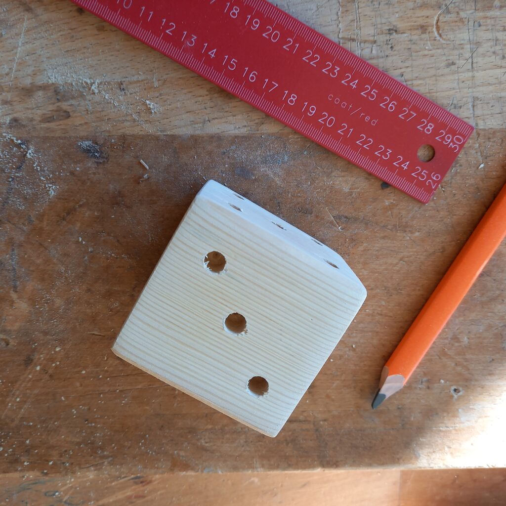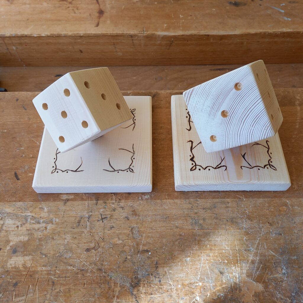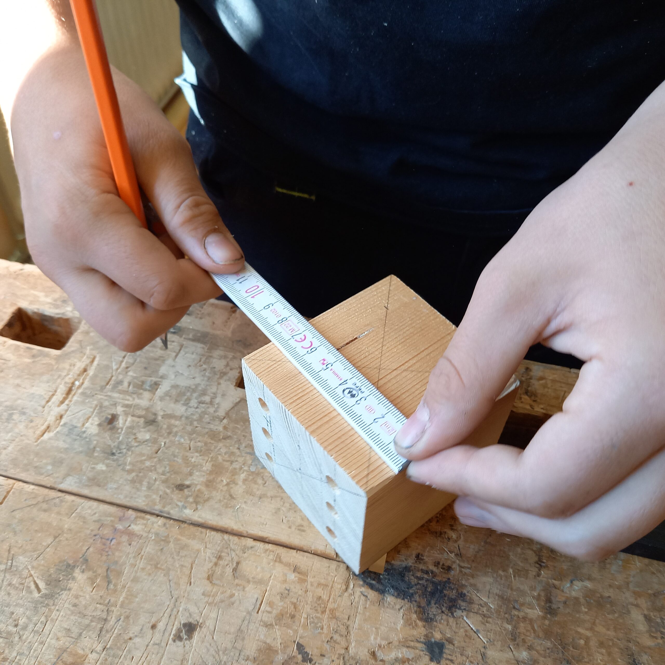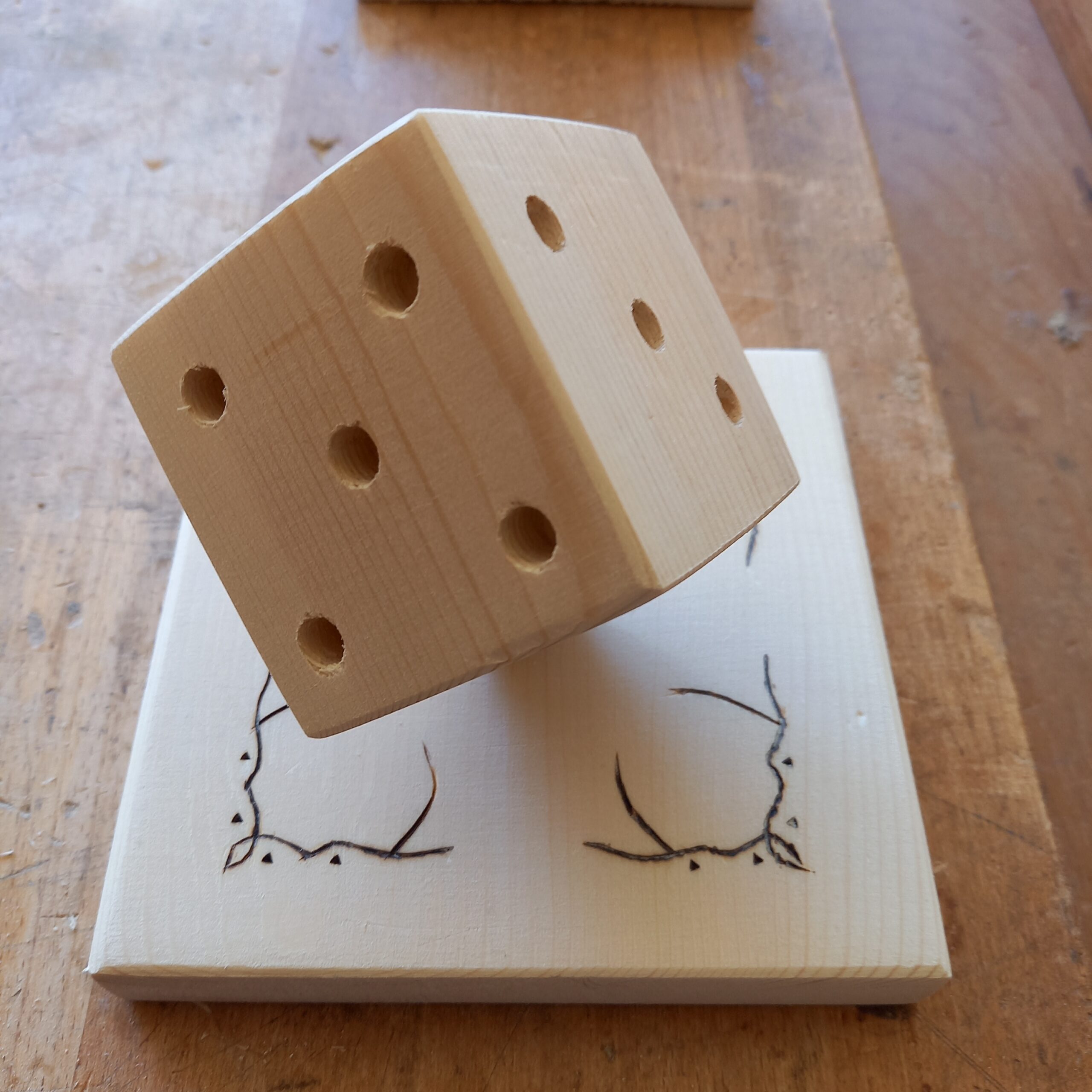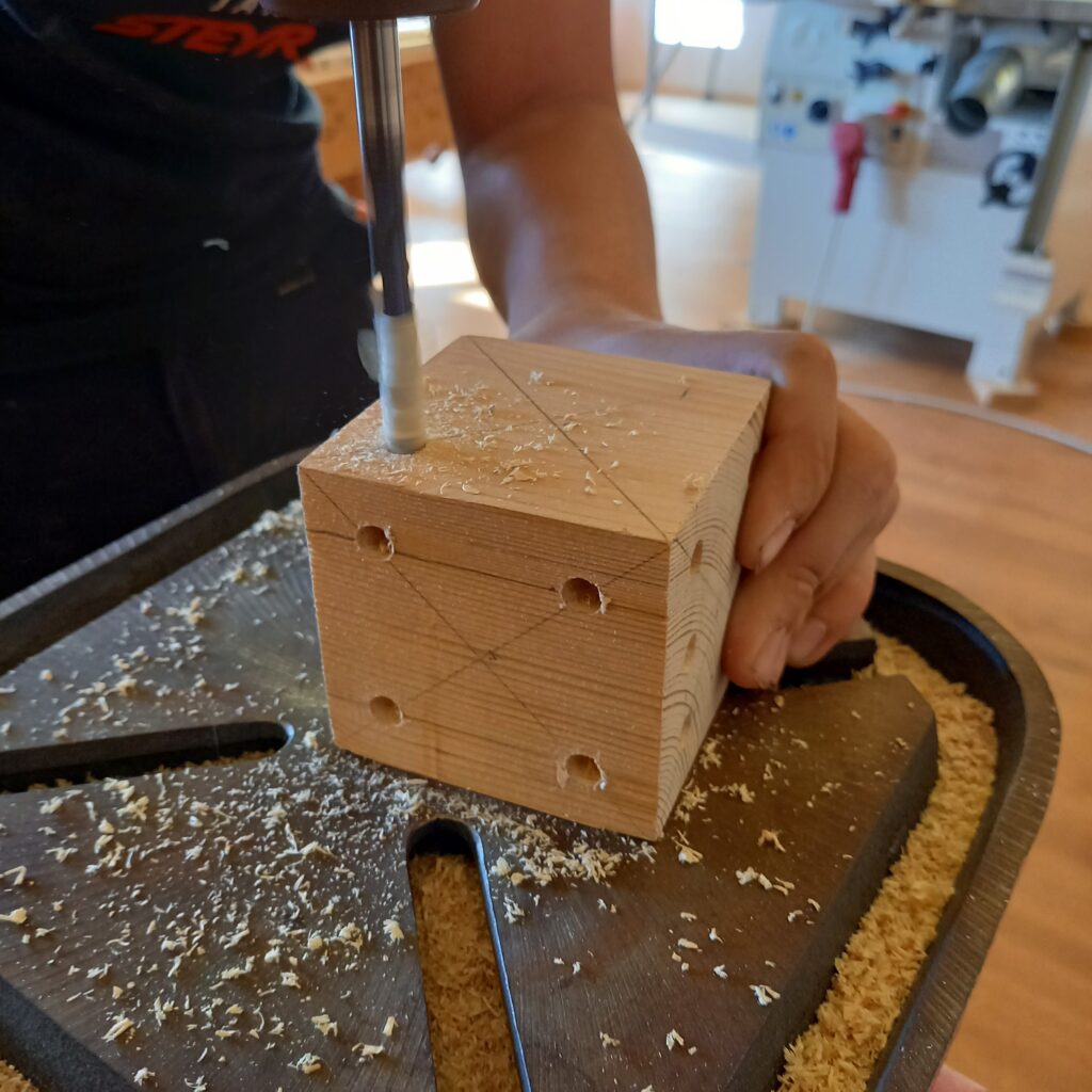 Als traditionelles „Einstandswerkstück“ fertigte die Holz-Gruppe einen Würfel, der auf einer selbst gestalteten Grundplatte montiert wurde.