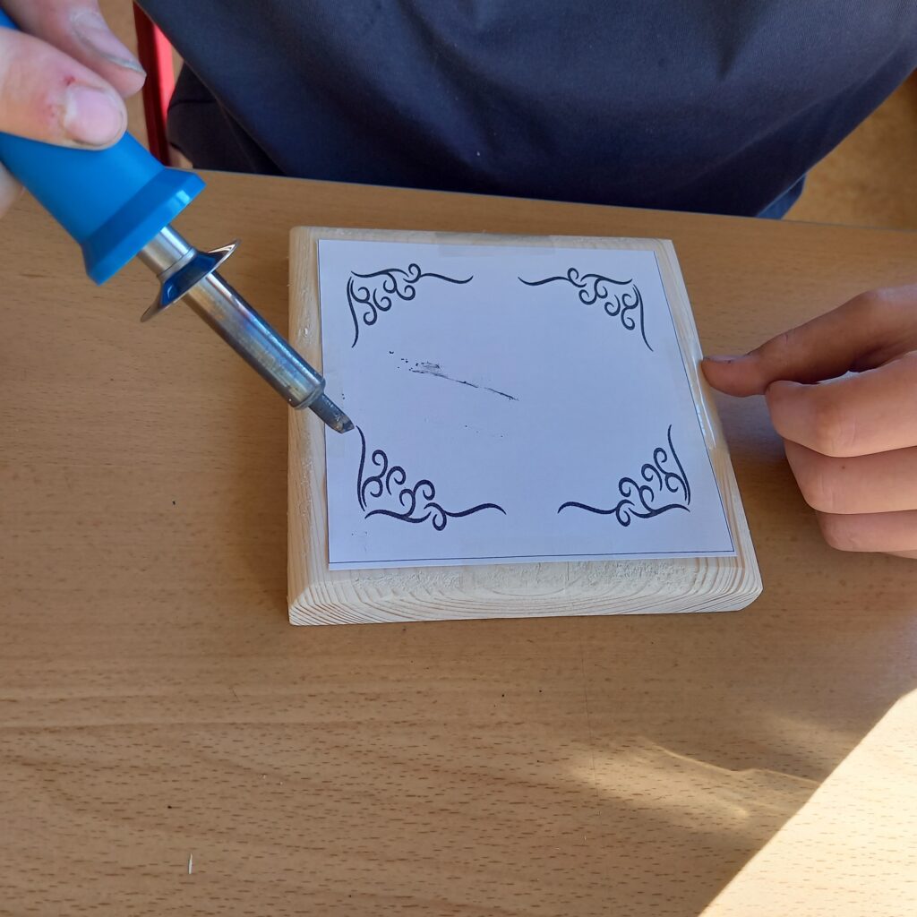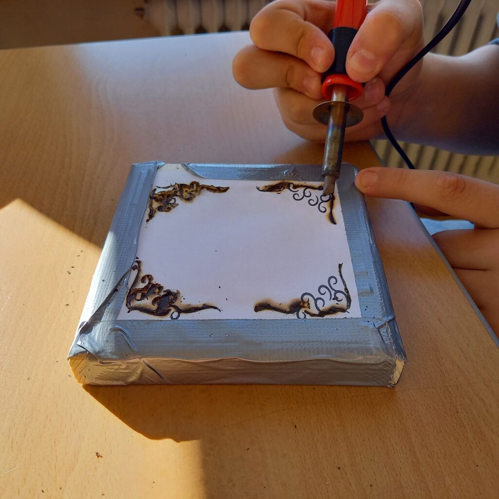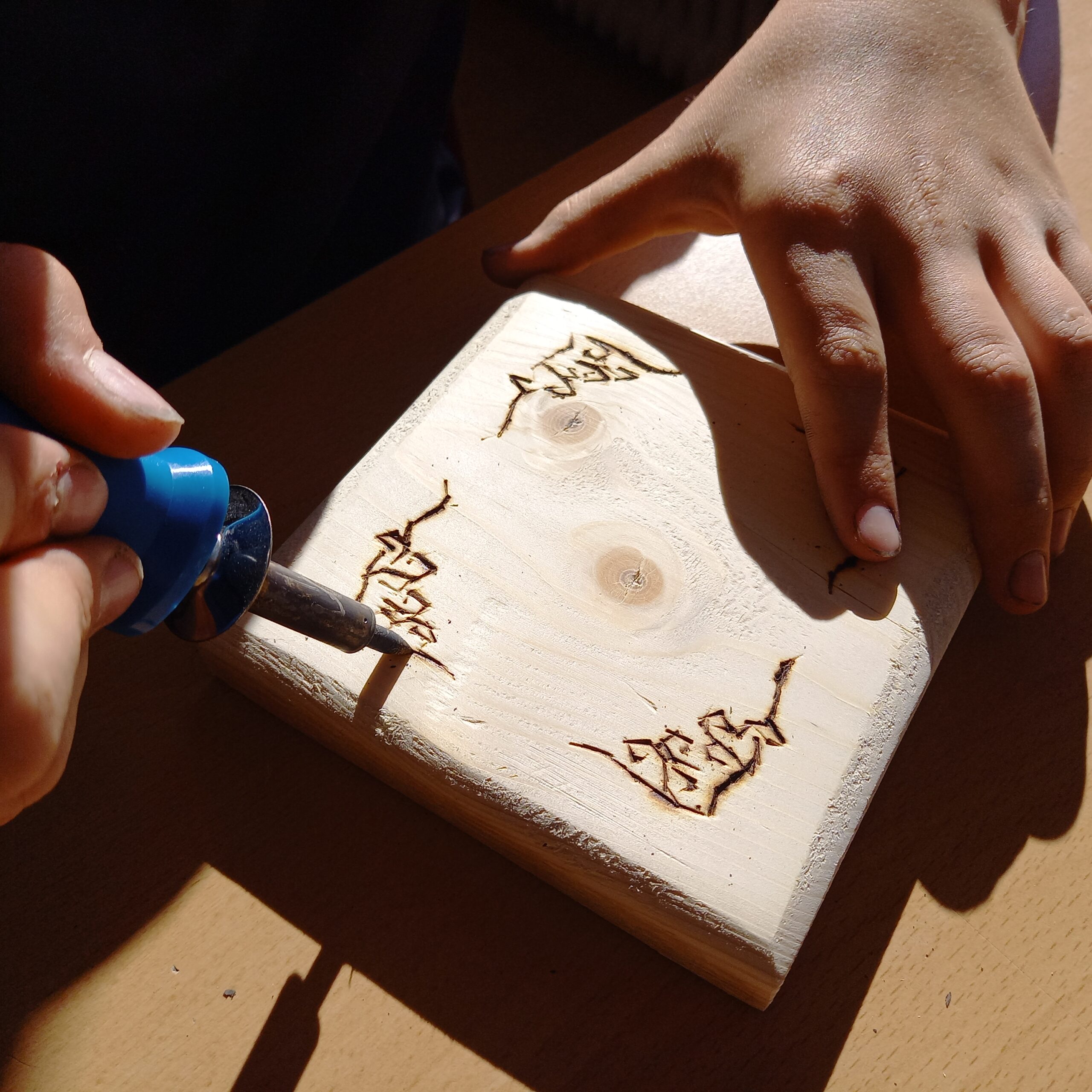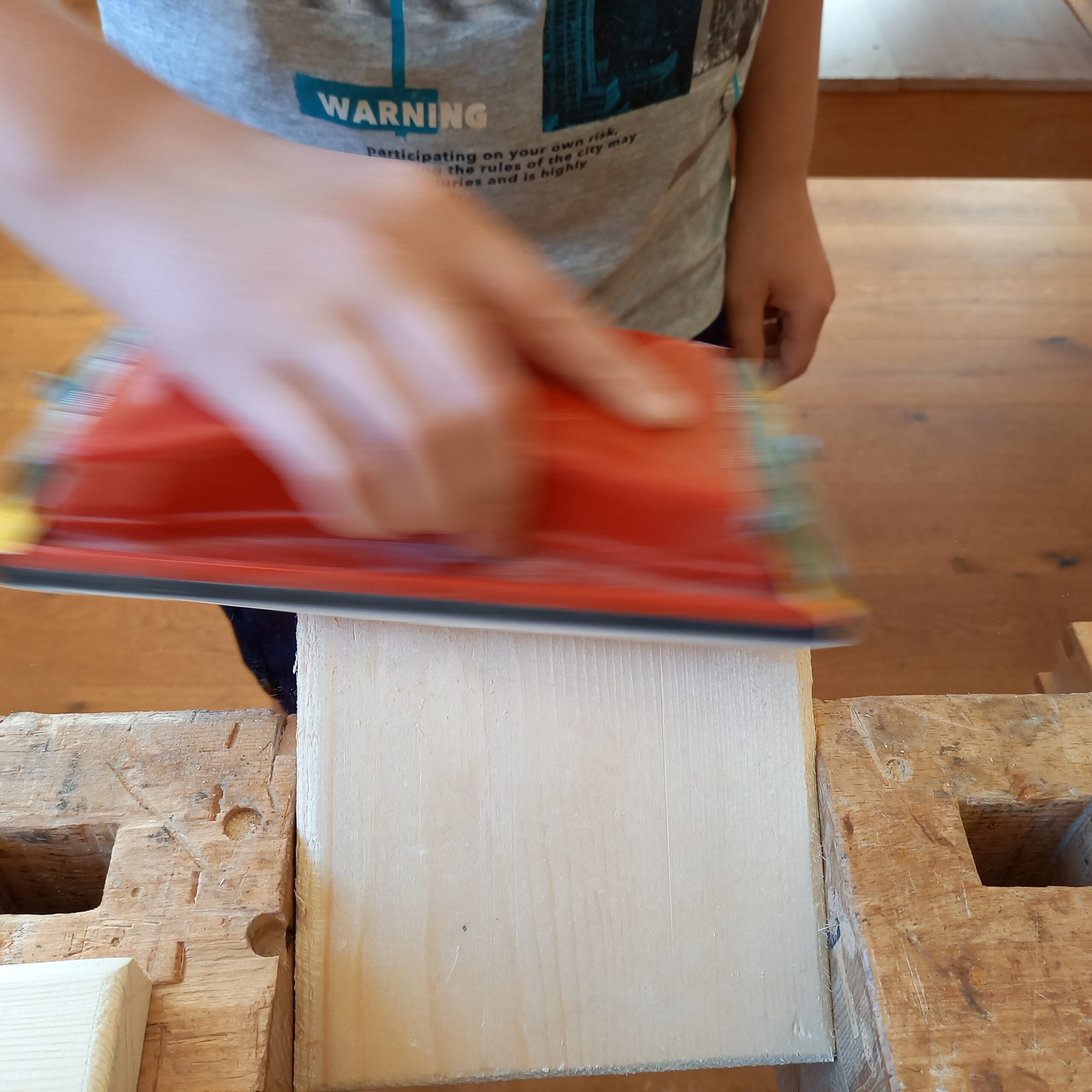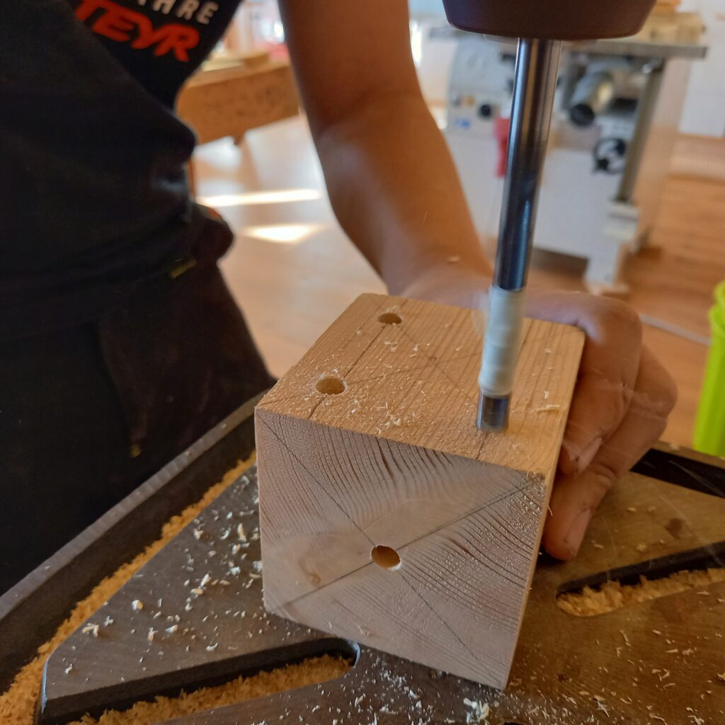 Als traditionelles „Einstandswerkstück“ fertigte die Holz-Gruppe einen Würfel, der auf einer selbst gestalteten Grundplatte montiert wurde.